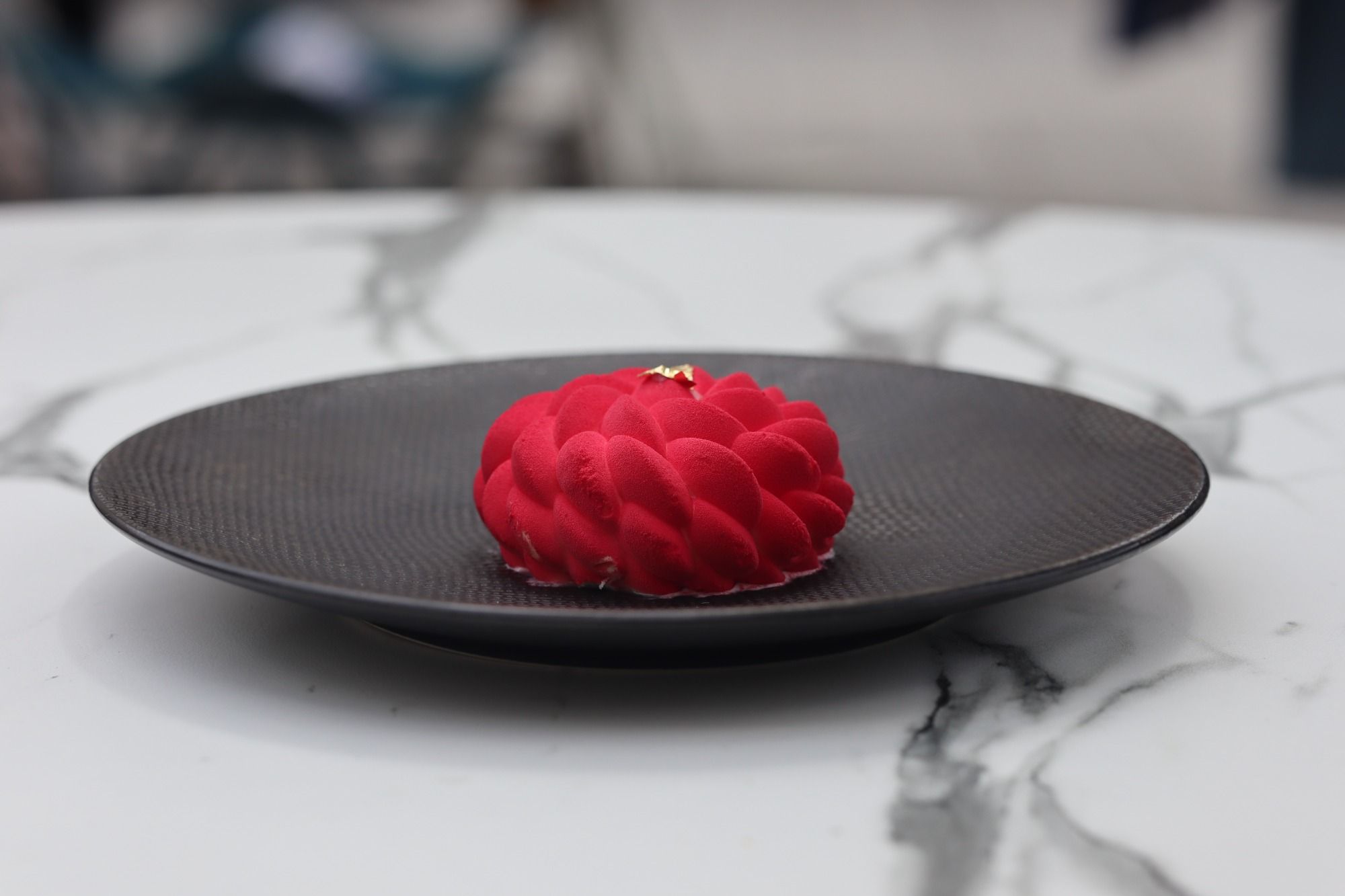 Une création conçue à partir d'un croustillant sablé reconstitué, une compotée de framboises ainsi qu'une mousse cheesecake.