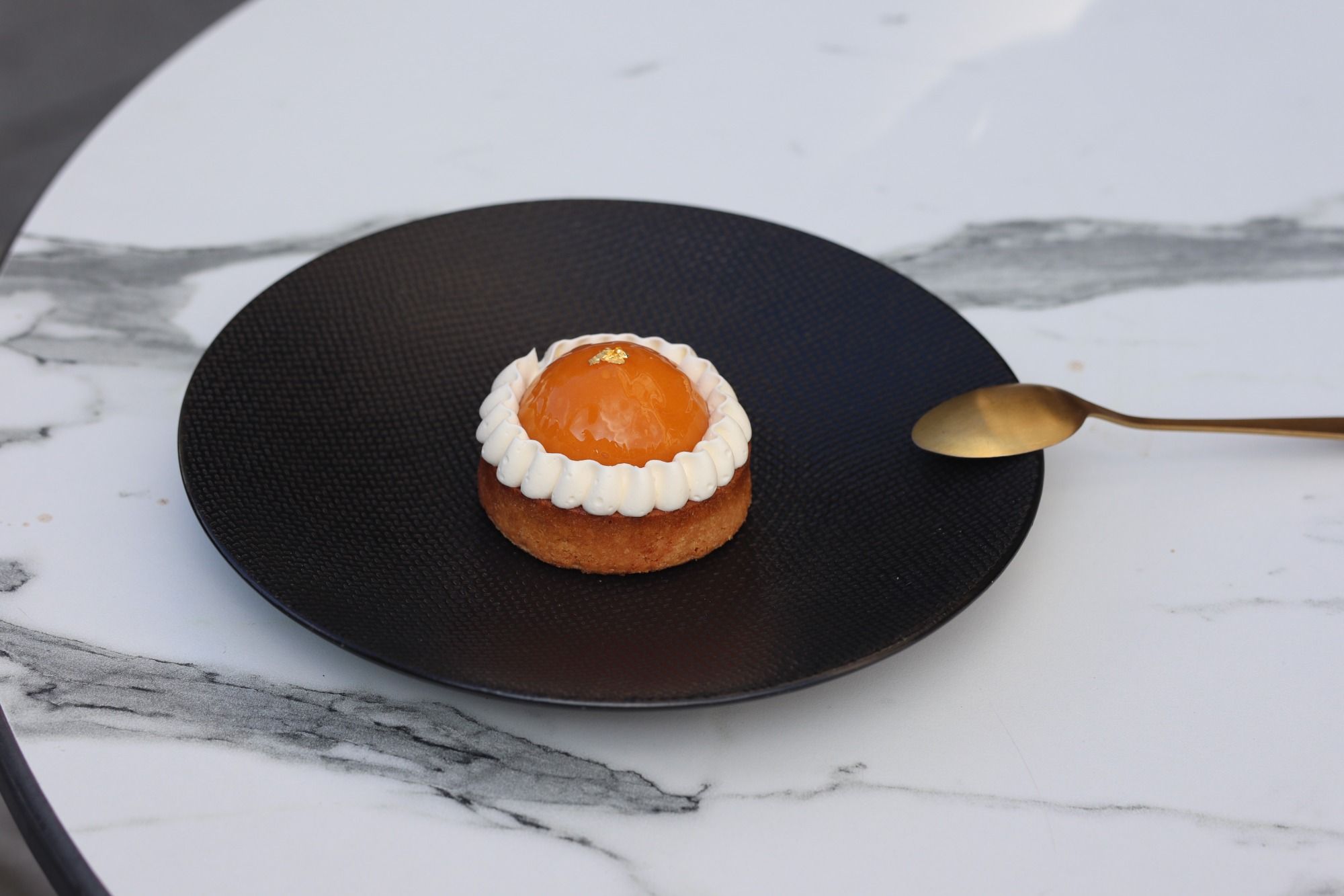 Conçue à partir d'un croustillant sablé, biscuit amandes moelleux, compotée abricot, crème anglaise montée à la gousse de vanille.