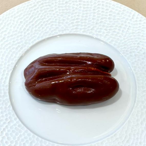Biscuit madeleine moelleux, relevé par un caramel beurre salé fondant. Un croustillant pécan, soutenu par un praliné pécan. La mousse vanille enveloppe l’ensemble, le tout délicatement protégé par une coque en chocolat au lait craquante.
